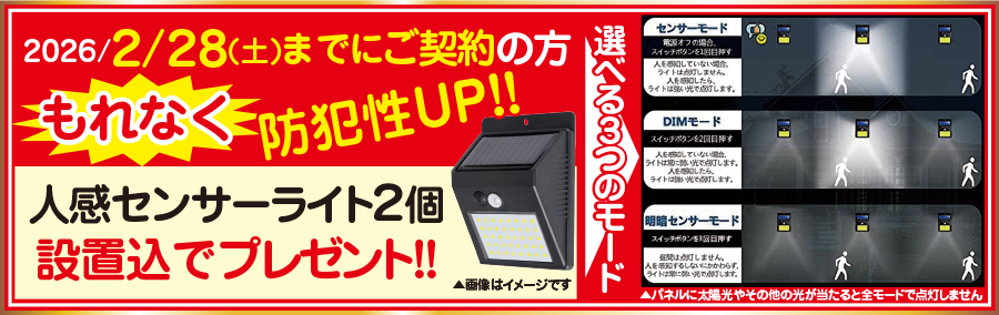 更にご契約の方にもれなく“人感センサーライト2個”を設置込でプレゼント!!
